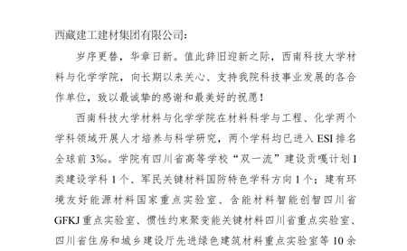 近日,西南科技大学材料与化学学院向西藏建工建材集团发来感谢信,对集团长期以来在科技事业发展、产教融合推进等方面给予的鼎力支持与深度赋能致以最诚挚的感谢,并致以辞旧迎新的美好祝愿。来源:科技和信息化部/数字中心责编:边巴央珍校对:刘波审核:郭玉龙